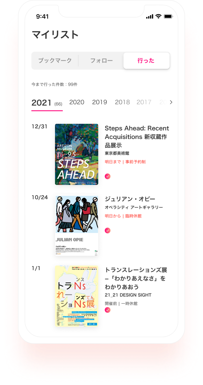 行った展覧会をマイページに記録することで、各年ごとに振り返りができます。