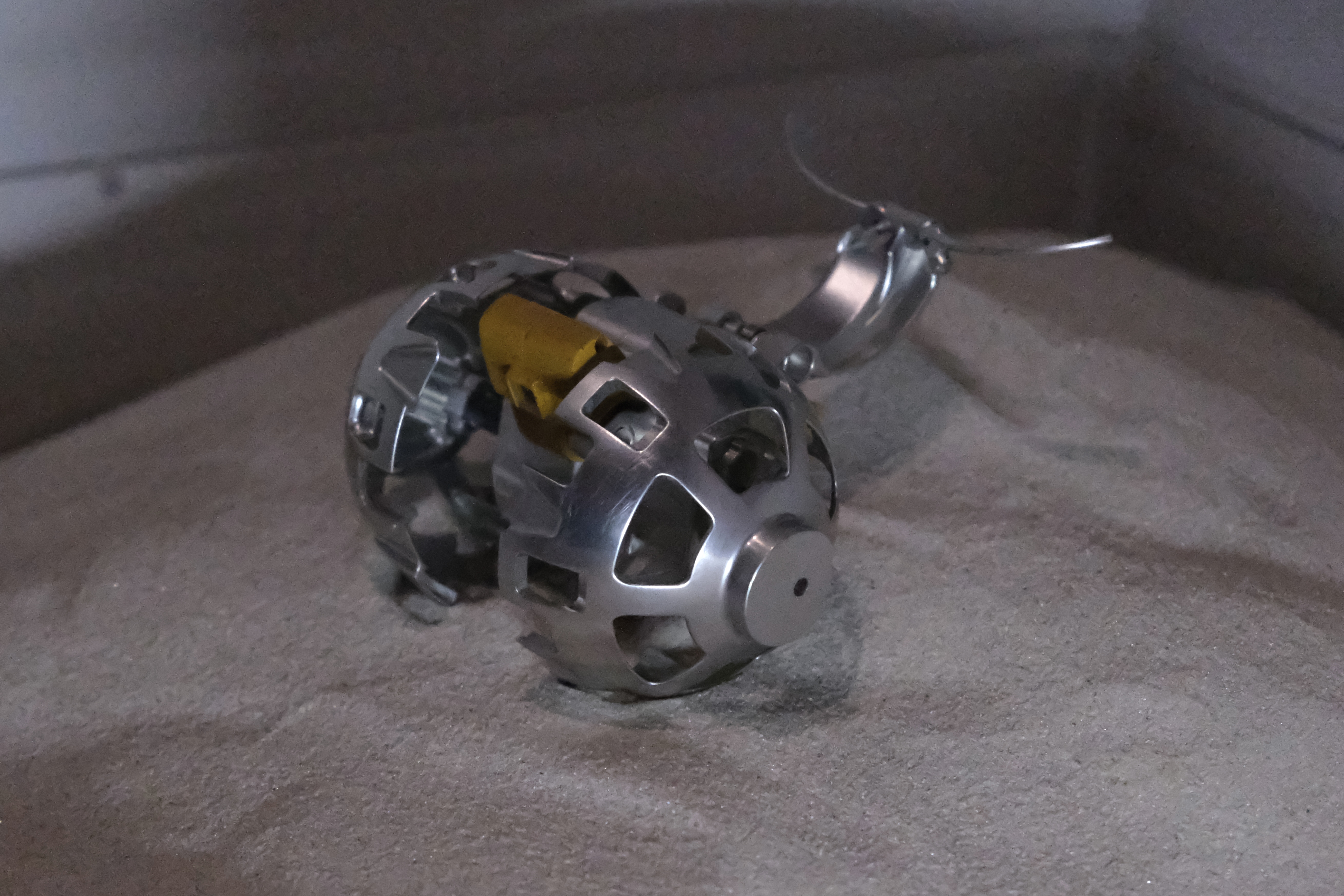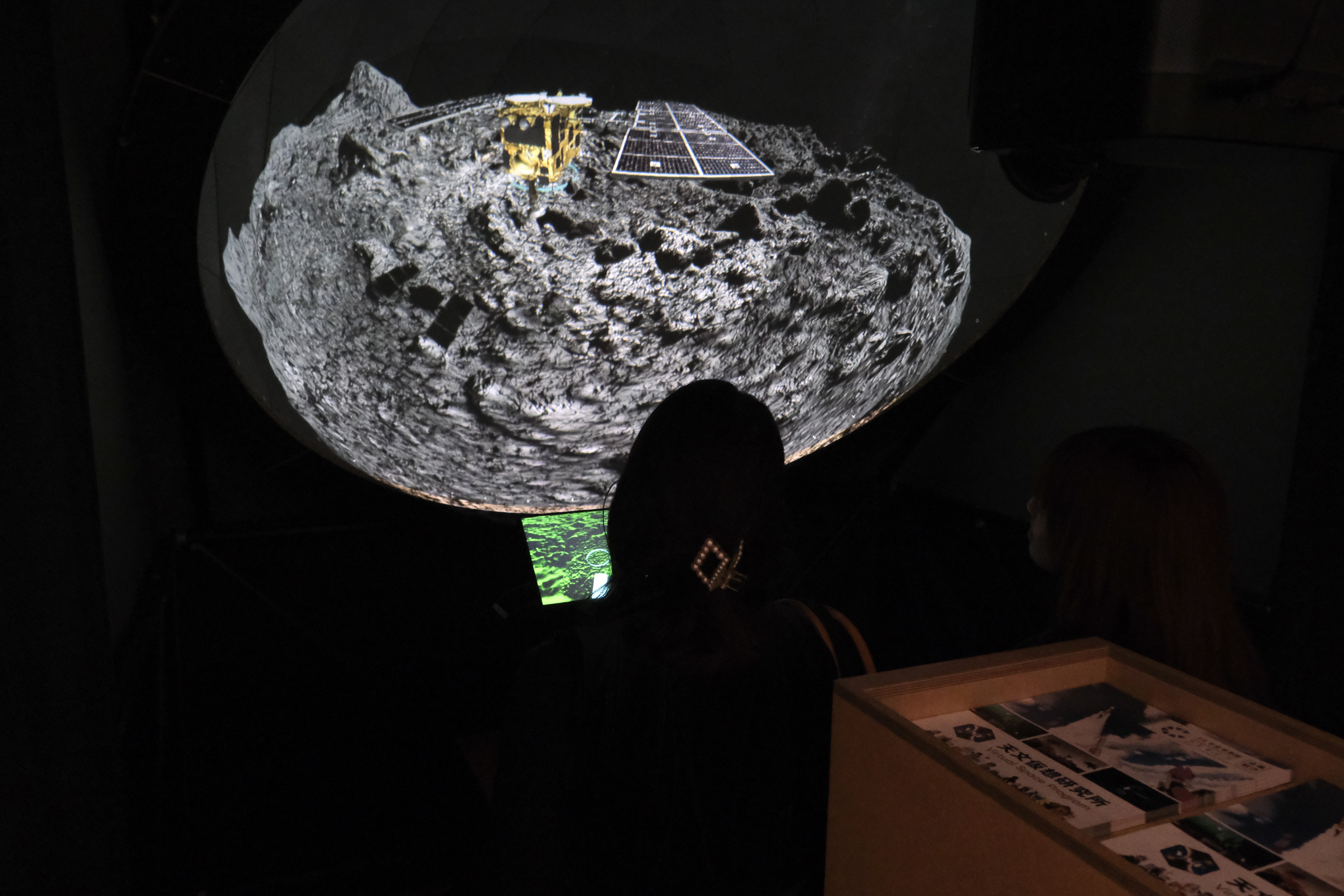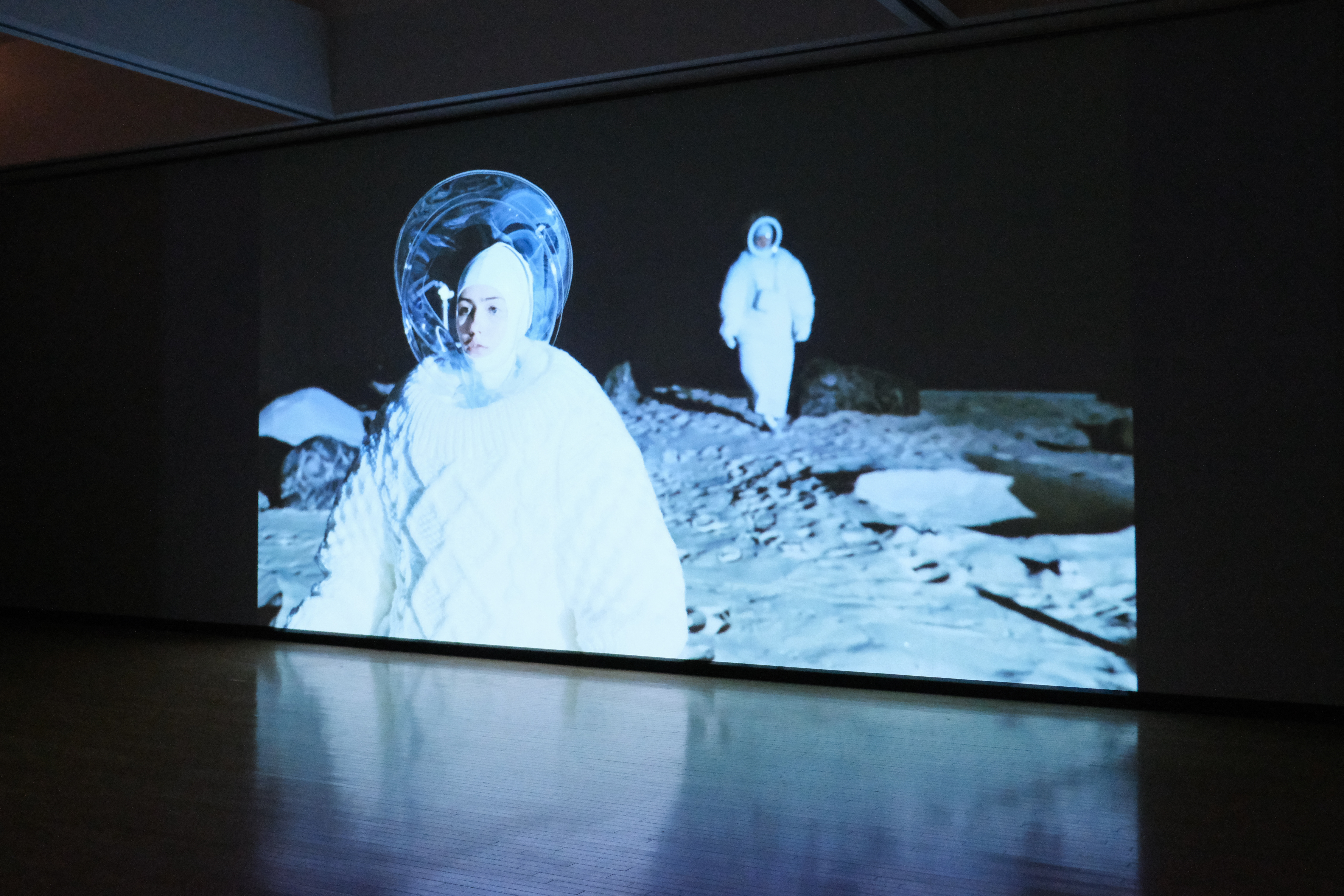 同じ部屋には、JAXA、株式会社タカラトミー、ソニーグループ株式会社、同志社大学の4者が共同開発した世界最小・最軽量の変形型月面ロボット《SORA-Q》や、ファッションブランド、アンリアレイジの2022-23年秋冬コレクション《PLANET》も紹介されている。同コレクションは、JAXA相模原キャンパスの「宇宙探査実験棟」に再現された月面空間を舞台にショー映像が制作され、宇宙服素材を応用したリアルクローズとして注目を集めた。本展では、コレクションピース(一部)の展示のほか、ショー映像の上映も行われている。