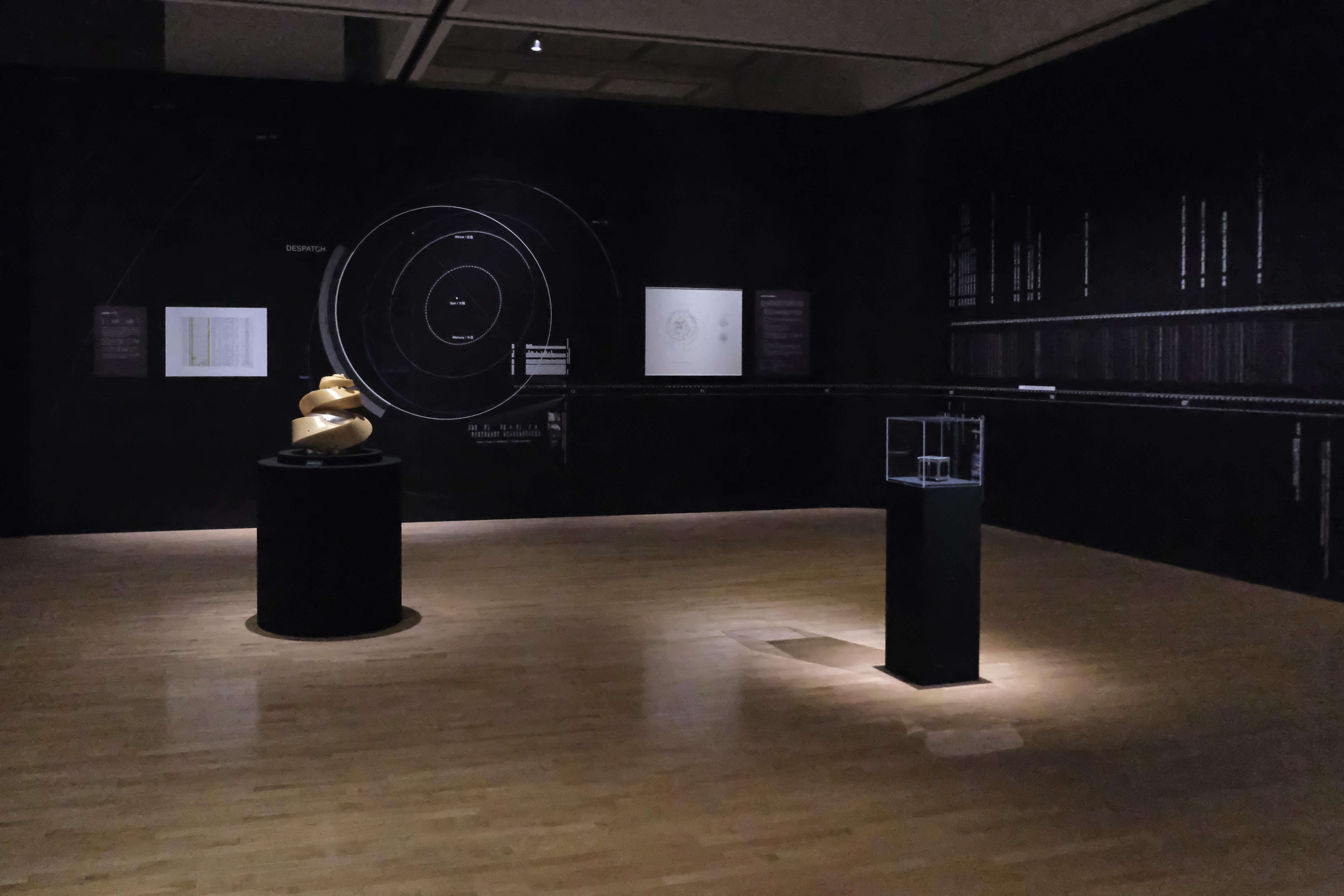 《DAWN》の奥につづく空間では、宇宙開発とアートやファッションの領域によるコラボレーションの事例が紹介される。世界初の芸術衛星「ARTSAT1: INVADER」と深宇宙彫刻「ARTSAT2: DESPATCH」からなる、《ARTSAT Chronicle》は「宇宙と地上を結ぶメディア」として芸術/工学のジャンルを横断した取り組みだ。