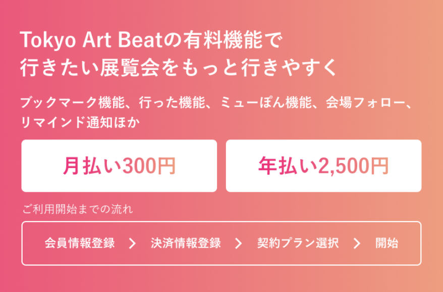 Tokyo Art Beatの有料機能は、月額300円・年額2500円でご利用いただけます。展覧会によってはミューぽんで200円割引になるケースもあるので「気になる展覧会を月に1〜2本観る」という方なら、それだけで十分お得にご活用いただけます。