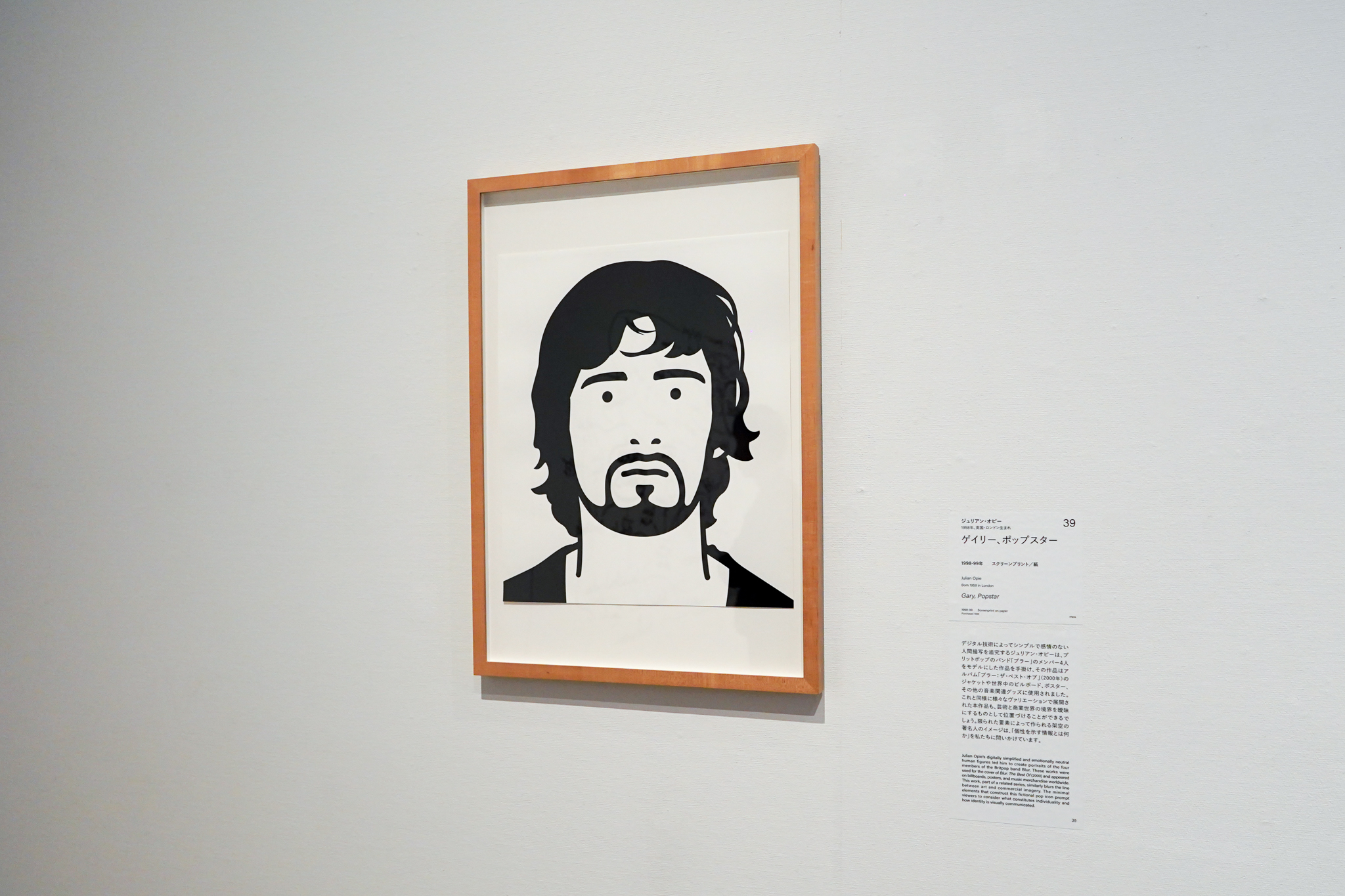 ジュリアン・オピーは、デジタル技術を用いたシンプルな人物描写で知られる作家だ。ブリットポップの代表的なバンドのひとつ、ブラーのメンバー4人をモデルにした作品を手がけ、その作品はアルバム「ブラー:ザ・ベスト・オブ」のジャケットや世界中のビルボード、ポスターなどに使用された。本展で紹介される《ゲイリー、ポップスター》(1998〜99)も同様に様々なヴァリエーションで展開された作品で、芸術と商業世界の境界を曖昧にするものとして位置づけることができる。