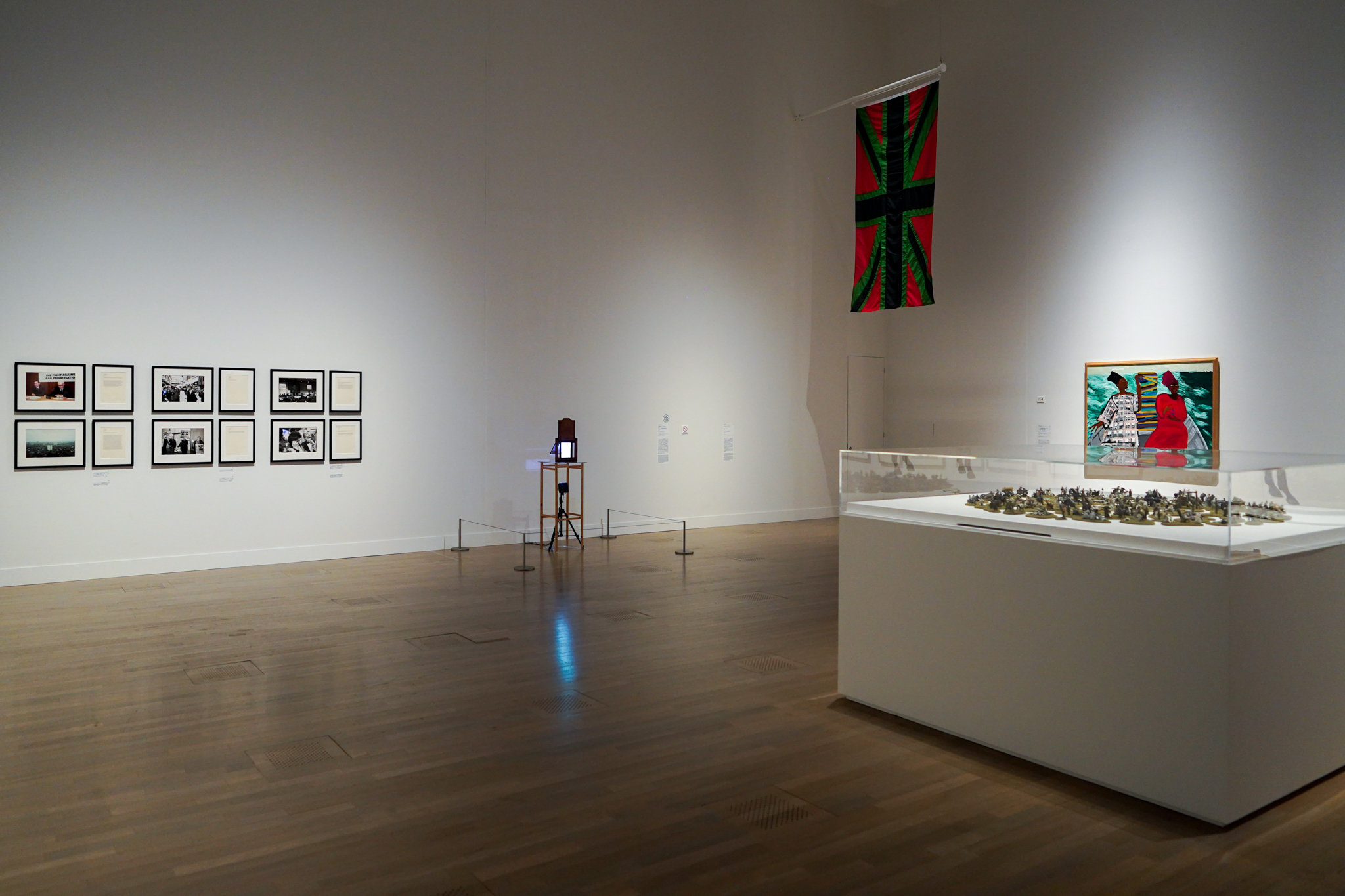 また、本作を上から見守るかのように、クリス・オフィリの《ユニオン・ブラック》(2003)が展示されている。英国旗「ユニオン・フラッグ」の白・青・赤を、アフリカ系の人々の解放と自由を掲げる汎アフリカ主義運動の三色旗、緑・赤・黒に置き換えた作品だ。2003年のヴェネツィア・ビエンナーレで英国館の屋上に掲げられ、英国の多文化主義を象徴する作品として人々の記憶に刻まれた作品でもある。