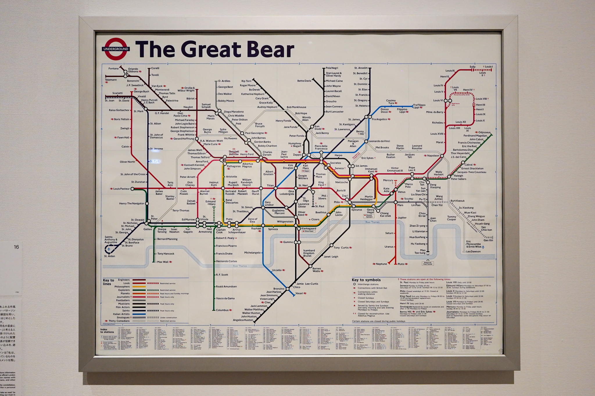 第2章では、都市の急速な変化に目を向け、その表象や空間を独自の視点で読み解いたアーティストたちを紹介する。たとえば、サイモン・パターソンによる《おおぐま座》(1992)は、情報やその信頼性について、ユーモアを交えつつ鋭く問いかける作品である。一見、ロンドンの地下鉄の公式路線図に見えるが、近づいてみると駅名は哲学者や俳優、政治家をはじめとした著名人の名前に置き換えられていることに気づく。地図や図表が信頼できる情報源だと信じる私たちの思い込みを、遊び心をもって裏切っているのだ。