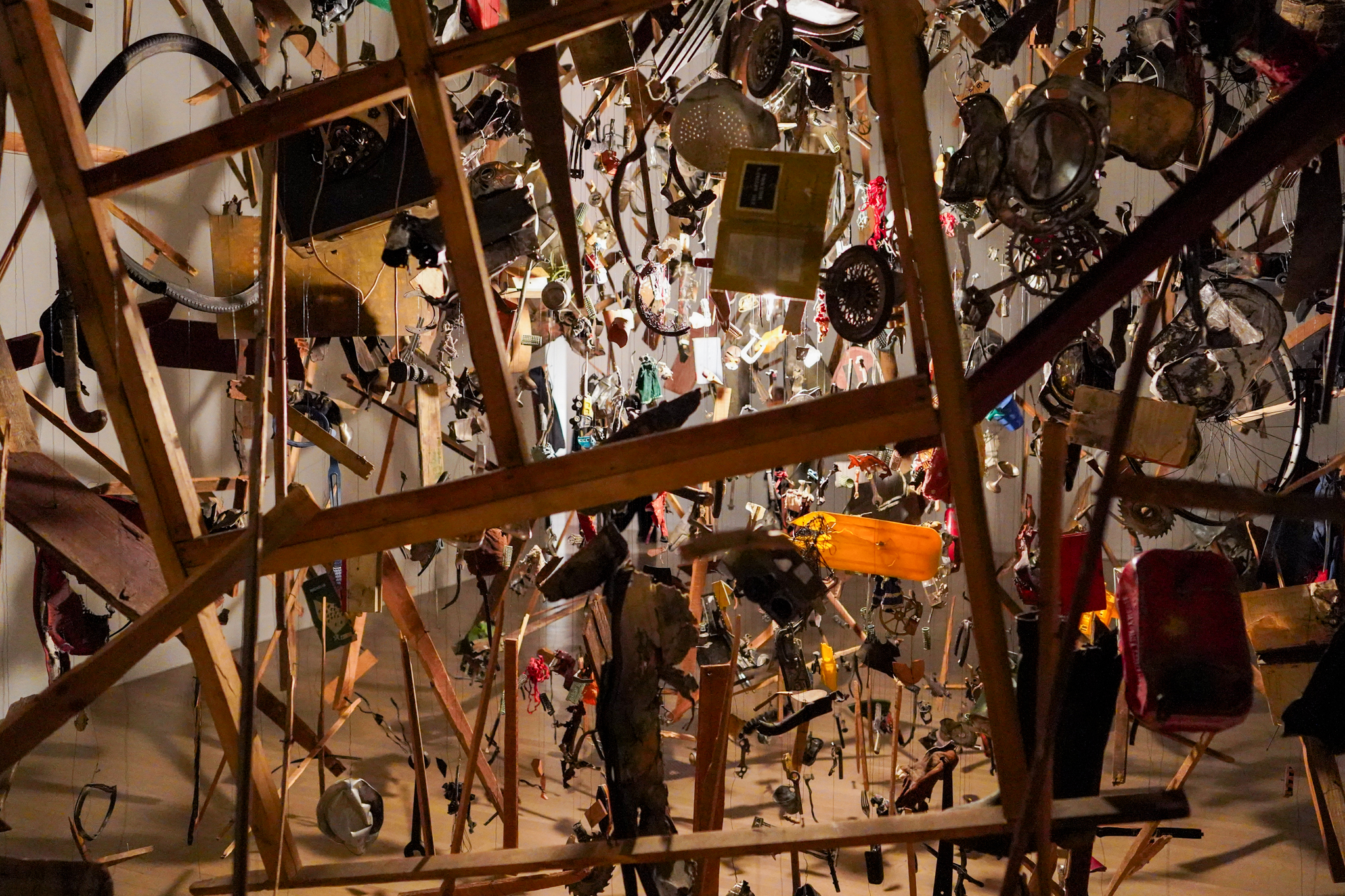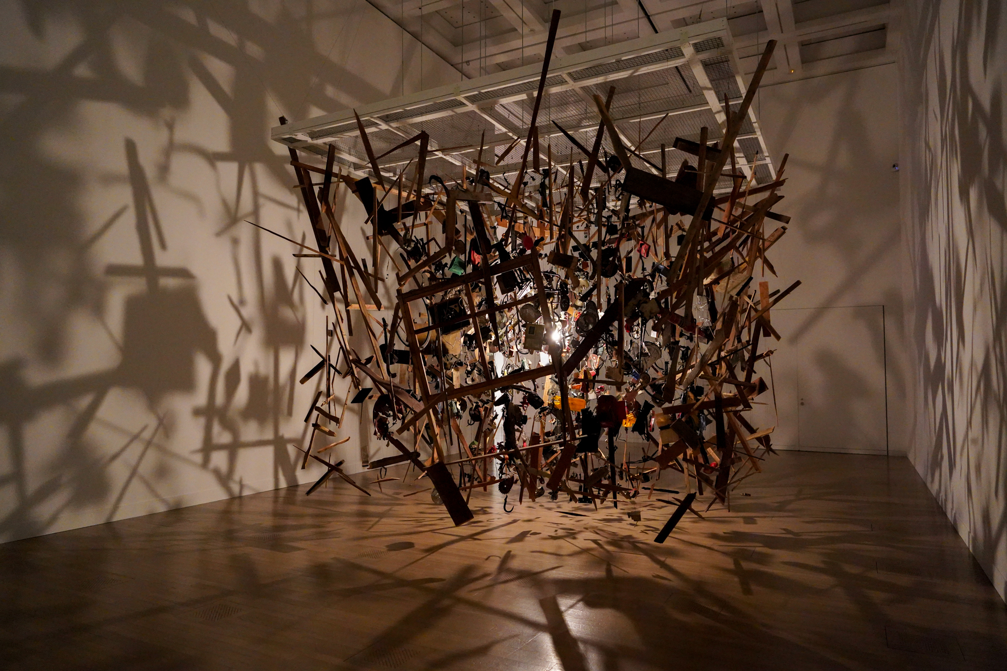 なかでも特筆すべきは、コーネリア・パーカーの《コールド・ダーク・マター:爆発の分解イメージ》(1991)だ。北アイルランド紛争が終焉に向かう時代、IRAによる爆破事件が英国内で立て続けに起き、社会の関心が高まっていた。そんななか、パーカーは、英国陸軍に庭の物置小屋を爆破することを依頼した。その残骸を一つひとつ拾い上げ、天井から紐で吊るし、中央に電球を設置。小屋の断片は空間に浮遊しているように見え、爆発の瞬間を切り取ったかのようなイメージが作り出される。