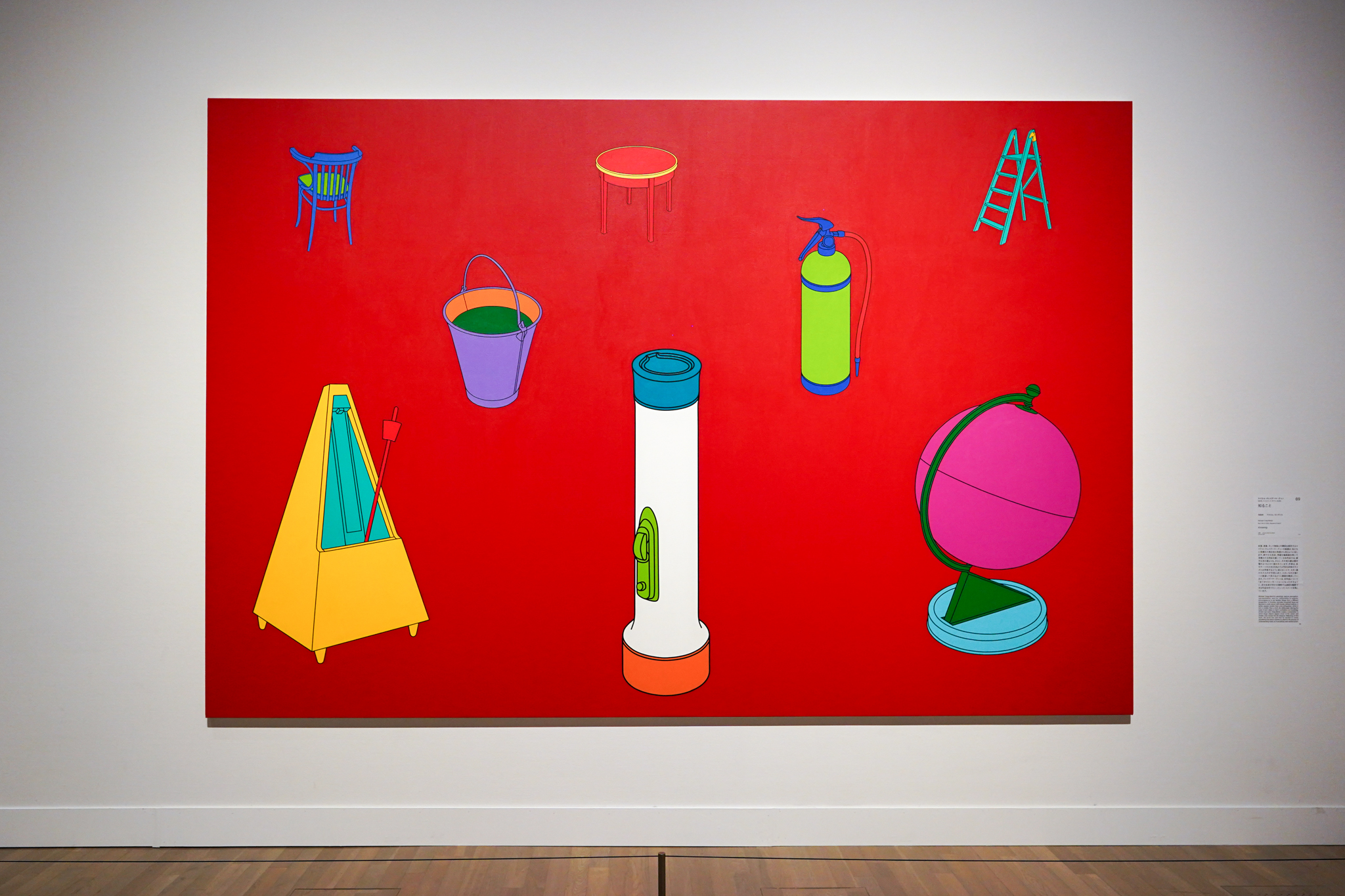 鮮やかな赤の絵画は、先行世代としてYBAの躍進にもっとも大きな役割を果たしたマイケル・クレイグ=マーティンによるものだ。明確な輪郭線を用いて日用品を描いた《生まれ知ること》(1996)では、梯子は消火器よりも、さらにその消火器は懐中電灯よりも小さく描かれている。クレイグ=マーティンは、各モチーフの大きさを実際のサイズとは異なる比率で描くことで、遠近感を操作している。大きく描かれたものが手前に、小さいものが奥へと後退して見える画面構成は、私たちに見慣れた物を別の角度から見るように促す。