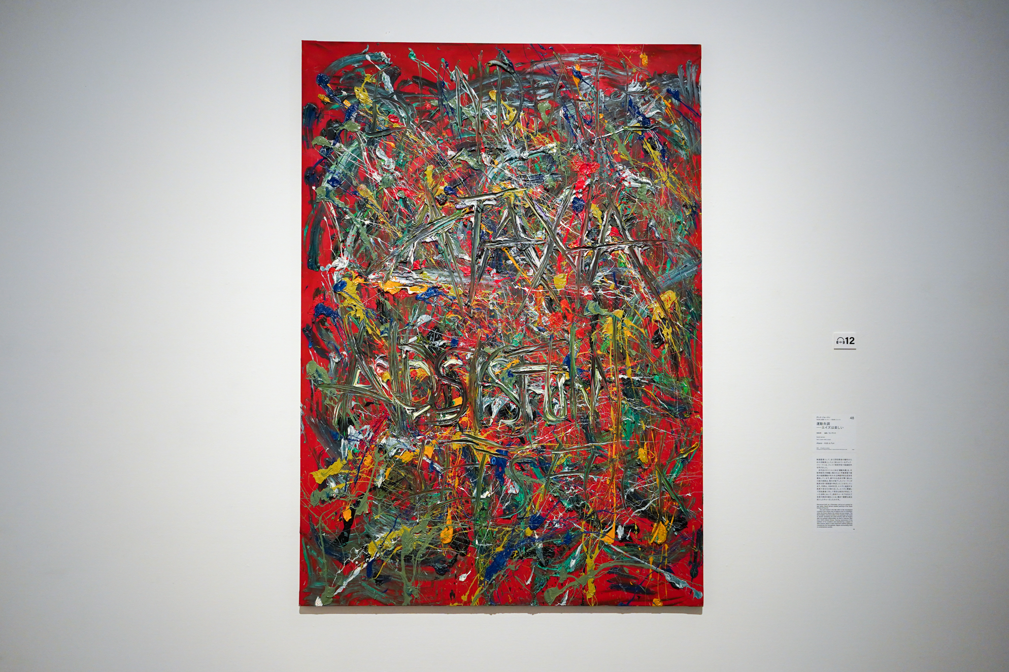 1980年代から90年代のHIV/エイズ危機も忘れてはならない。映画監督として、また同性愛者の権利のための活動家としても知られるデレク・ジャーマンの《運動失調—エイズは楽しい》(1993)は、皮肉やユーモアを交えて自身の病状を語る重要な作品のひとつ。タイトルにある「運動失調」は、中枢神経系が病魔に侵されると平衡感覚や筋肉の協調運動が失われる神経学的な症状を意味している。鮮やかな色彩が厚く塗られた絵の表面は、視力が低下したジャーマンが絵具を指で直接塗り伸ばしたことを示している。同性愛者に対して厳しい差別が存在していた当時において、本作は率直な心の内、歓び、アイロニー、そして抵抗のあり方を表現していた。