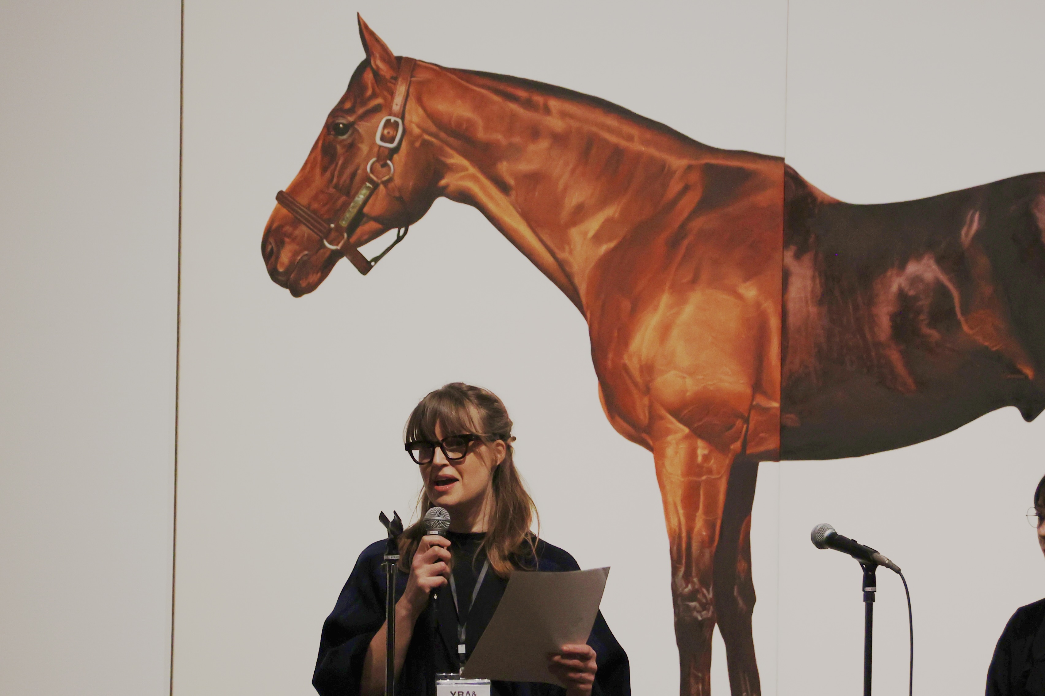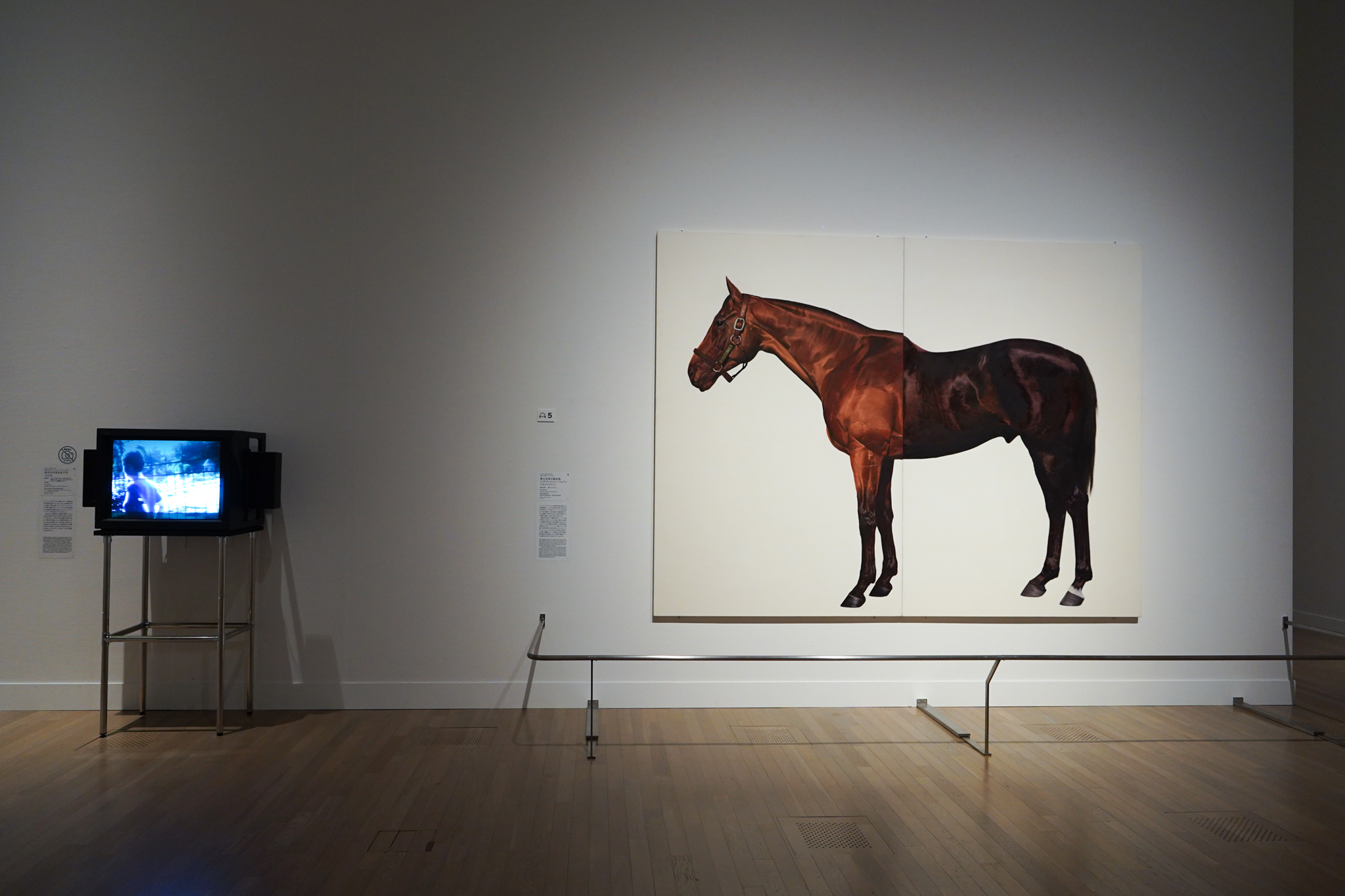 マーク・ウォリンジャーの《異父兄弟の競走馬(イグジットトゥノーウェアとマキャベリアン)》(1994〜95)は、英国の伝統や社会問題を鋭い視点でとらえた作品。1980年代末から90年代初頭にかけて実際に活躍した名馬の名前に由来する本作では、価値ある血筋を引く2頭の体の組み合わせが、パントマイムの舞台でふたりの演者が一頭の馬を演じる姿に重ねられている。競走馬の世界の血統主義や優生学的な評価、さらには家柄や階級について皮肉を交えて批評しているとも言える。