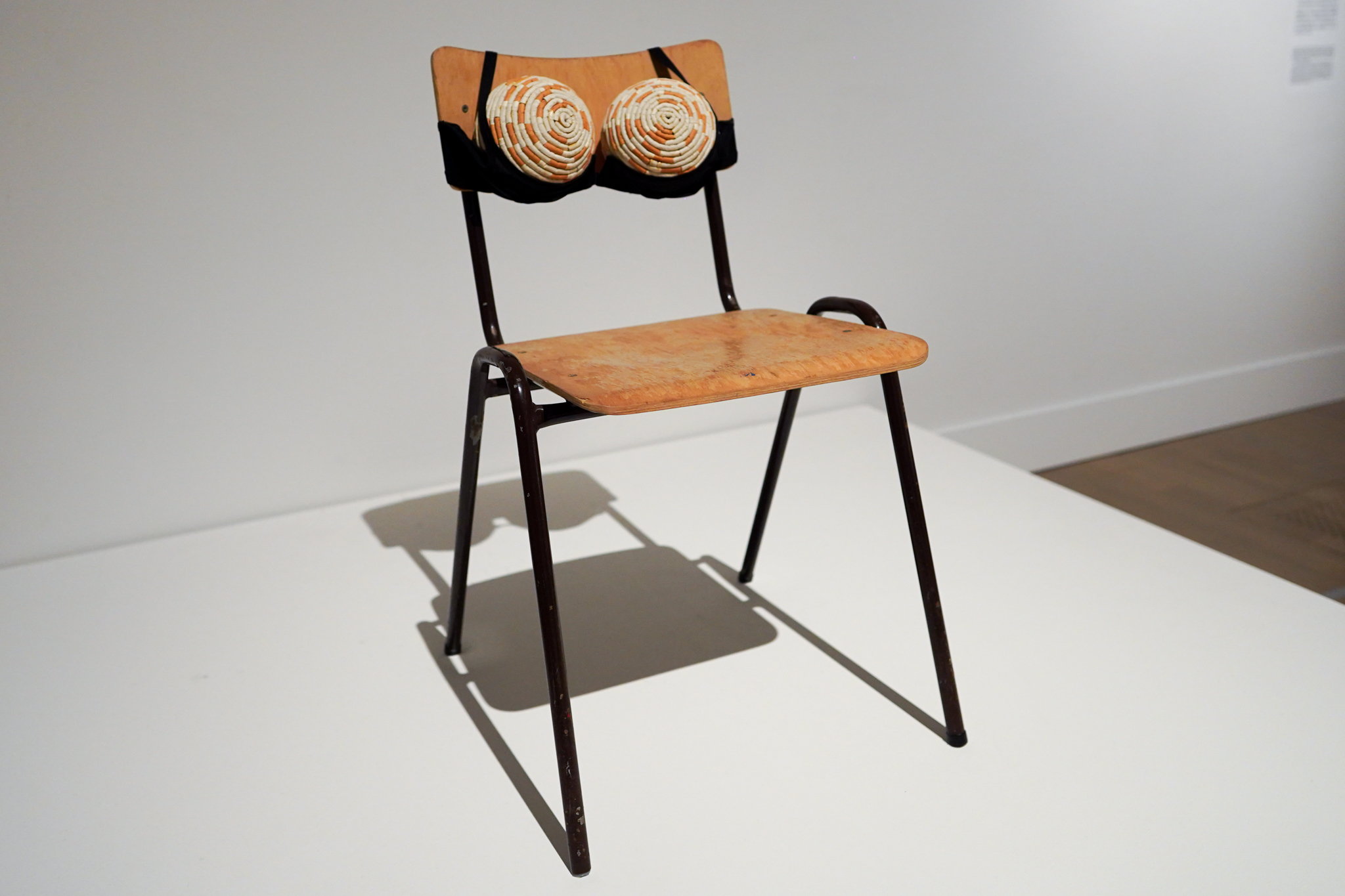 サラ・ルーカスの《煙草のおっぱい(理想化された喫煙者の椅子II)》(1999)は、家庭用品を革新的な方法で用いて、ジェンダーやセクシュアリティ、アイデンティティに関する伝統的な概念に挑戦する作品だ。ルーカスが煙草と椅子を用いるようになったのは1990年代初頭。それは椅子は安価で手に入れやすく、反抗的なアクセサリーとしての煙草は、自己を害することの象徴であると同時に、「立ち止まって熟考する」機会をもたらすものでもあったからだ。本作では、椅子が身体の代役となり、煙草で覆われたふたつのボールを黒いブラジャーで支えている。ルーカスは、ユーモアと男性社会に対する挑発や不快感を織り交ぜながら、当時の英国のタブロイド文化に表れていたジェンダー・バイアスへの批判を込めているという。