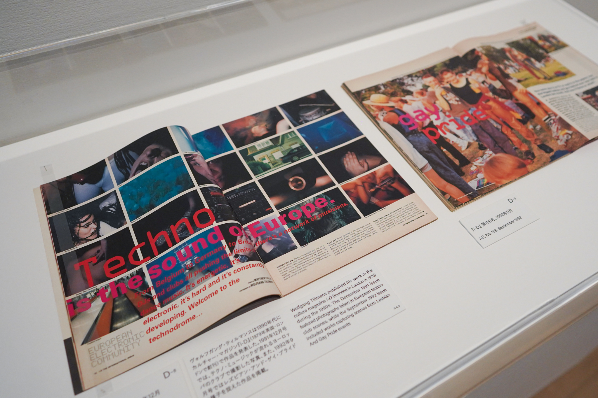 いっぽう、1990年代の大半をロンドン、ベルリン、ジャマイカのクラブシーンを横断して過ごしたヴォルフガング・ティルマンスは、ストリート・カルチャーとクラブ・カルチャー、テクノ・ミュージックとの密接な関係を築き、平和運動や同性愛者の権利獲得運動、エイズの問題にも積極的に関与した。当時は『i-D』のような雑誌がもっとも重要な発表の場であり、友人たちや静物、クラブシーンをとらえた写真は、雑誌の見開きの特集ページに登場した。本展では写真作品とともに、雑誌コーナーで当時の誌面も見ることができる。