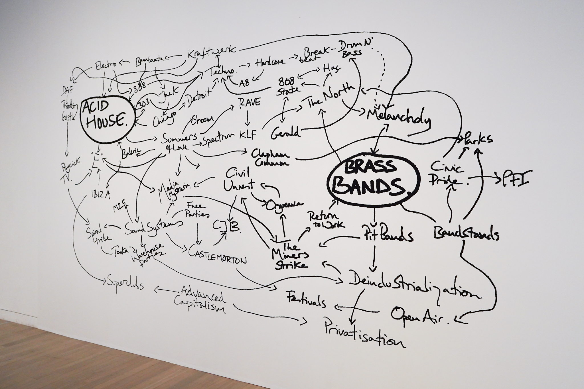 壁に直接書かれた図表は、異なる文化的な背景を持つ様々なグループとのコラボレーションに根ざした活動を展開するジェレミー・デラーによる作品だ。《世界の歴史》(1997〜2004)は、英国が工業国からポスト工業国へとどのように変化していったかをテキストと図表で示し、20世紀の英国の歴史についてのひとつの解釈を提示している。