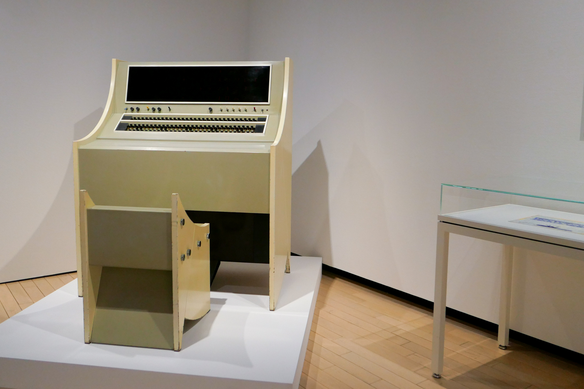 もうひとつの注目は、田中未知/高松次郎による《言語楽器(パロール・シンガー)》(1974)だ。本作は、1974年に田中未知の個展に初登場したもので、カタカナ配列の文字盤を備えた唯一無二の楽器である。各文字に音程が割り当てられ、言葉が音として記憶される。50年以上前の発表時の貴重なドローイングや、寺山修司の手書き資料とともに再構成されている。