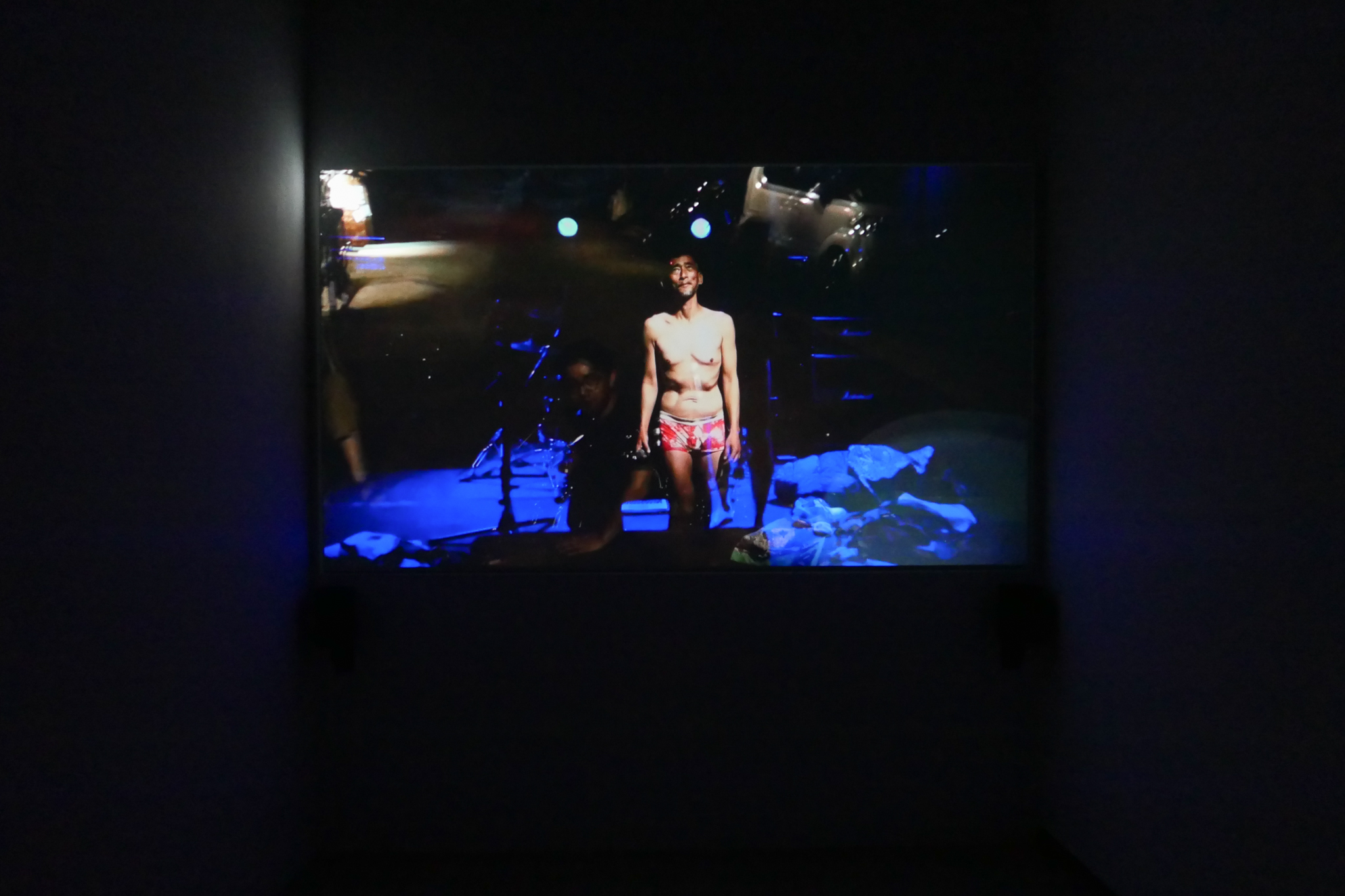 最後のコーナーでは昨年逝去した映像作家の大木裕之へのオマージュも展示されている。《meta dramatic 劇的》(2023)は、大木が恵比寿映像祭2023「第1回コミッション・プロジェクト」のファイナリストとして発表した作品で、「ドラマ」を外部や上位からとらえる「メタ」の視点と、「劇的な出来事」としての表現を重ね合わせ、現実と虚構、映像とライヴ、社会と個人の境界が交錯する現代の状況を探究する。スクリーンに映し出される映像と、空間内で同時に展開される生身のパフォーマンスは相互に作用し、観客に全体をひとつの体験として受け止めることを促す。本展示では、同館に収蔵された未公開の作品やインタビュー映像を展示し、大木の作品や活動の意味をあらためて知る機会となる。