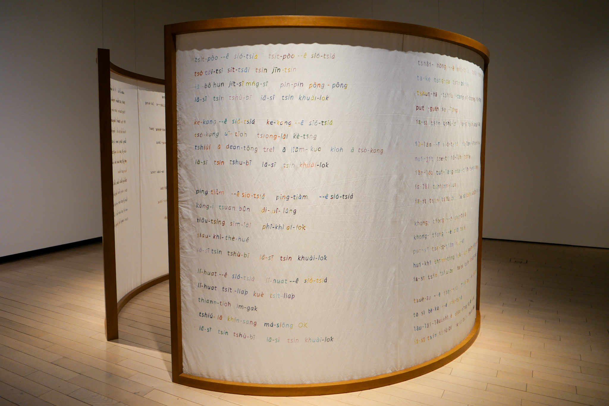 侯怡亭のもうひとつの作品《所有的小姐 Sóo-ū-ê sió-tsiá(レイディたち)》(2015)は、日本の植民地時代を終えた戦後の台湾に残る日本文化の影響を扱う。日本曲をアレンジし、当時の社会の雰囲気にあわせた台湾語の歌詞を付けるという風潮が日治時期からあったという。本作は、1950〜60年代の日本の楽曲3曲を台湾語でカバーした歌詞を、布に刺繍した作品である。あえて未完成の状態にすることで、言語の背後にある複雑な歴史や、歌詞を通じて当時の労働状況、社会階級を浮き彫りにしている。