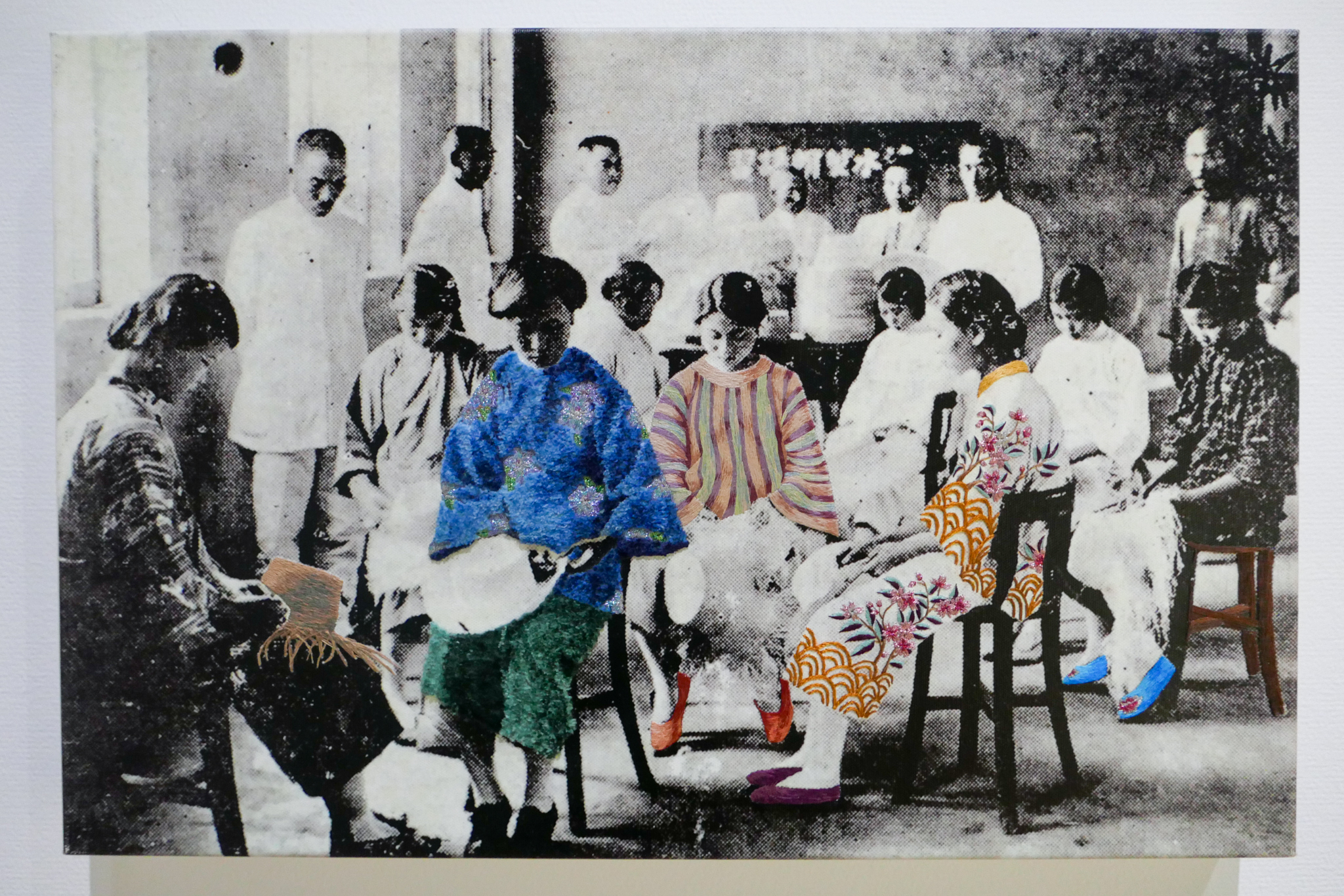 2階ではアイデンティティを模索する作品が並ぶ。侯怡亭(ホウ・イーティン)は、古い写真に刺繍するという行為で身体と歴史的イメージを再構築し、過去と現在を縫い合わせる手法で制作してきた。《歷史刺繡人Lı̍k-sú Tsiam-tsí lâng―帝国婦》(2019)シリーズは、日本の植民地時代に台湾に創設された家政女子学校の歴史を振り返り、当時女子生徒たちが生け花、刺繍、園芸という授業を通して教育される風景を記録した写真に刺繍を施すことで、女子の身体労働と社会的役割を問いかける。